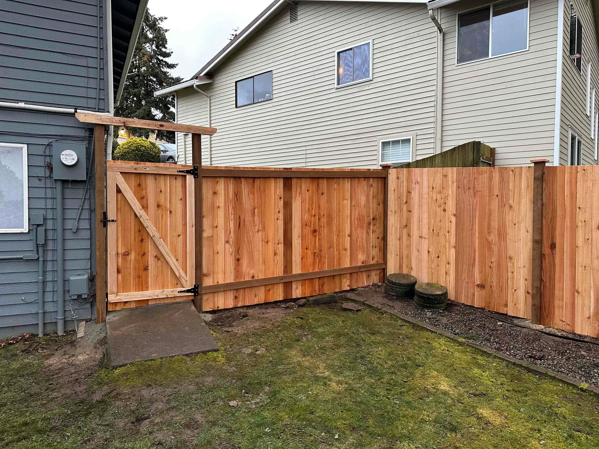 Old, rotting fences don’t just look bad—they drag down property value. That was the case for a homeowner in the 98023 area, where a gray, toppling rambler-style fence needed a serious upgrade. The transformation? A fresh 6-foot cedar estate fence with pressure-treated posts and stylish cedar post caps. Result: instant curb appeal and added value.