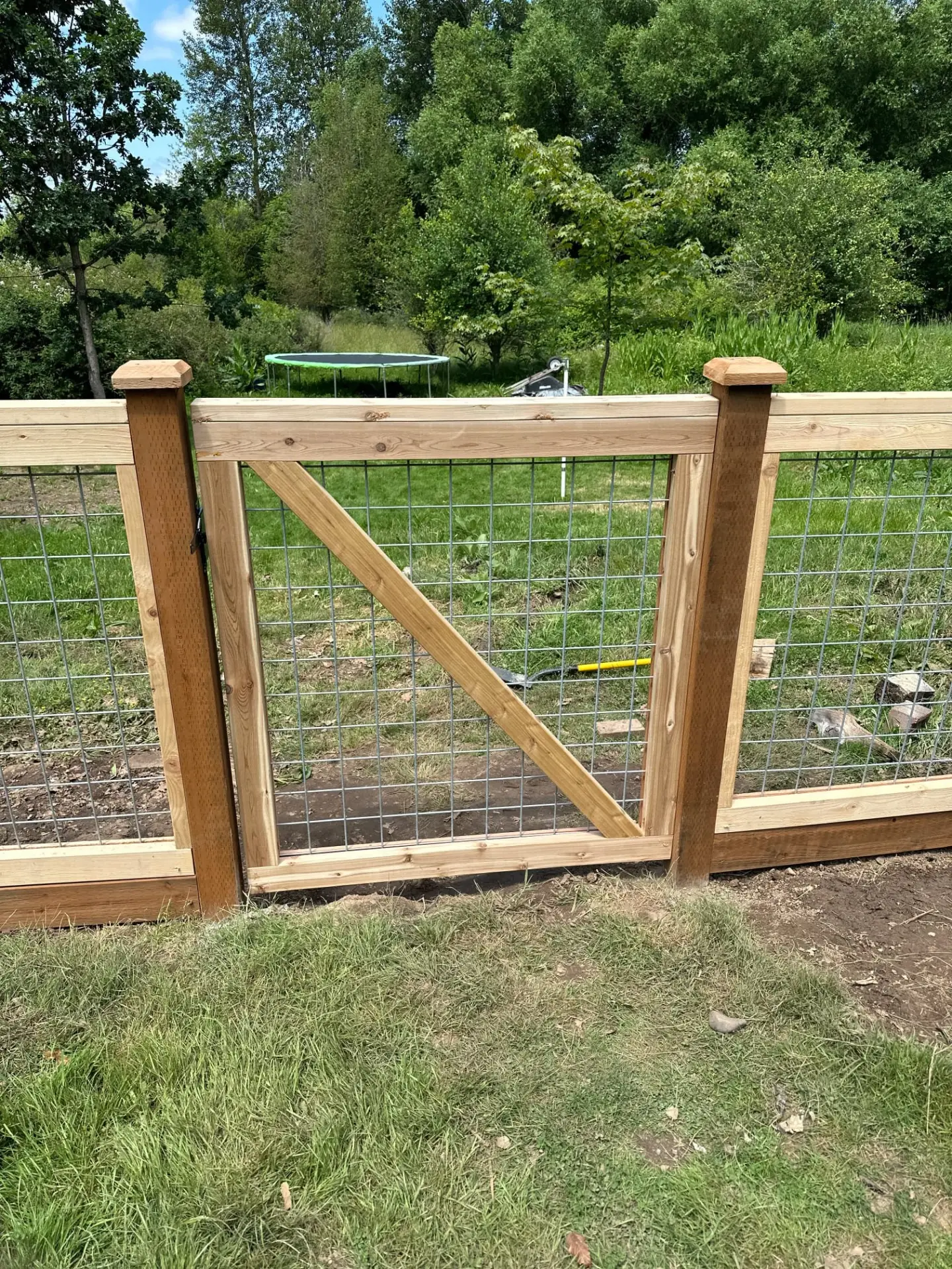 We installed 116 linear feet of 6-foot-tall horizontal cedar fencing alongside 82 linear feet of Hogwire fencing, utilizing Post Master steel fence posts for superior durability. To prevent soil buildup and rotting, a pressure-treated 2×6 rail was added along the bottom of the fence. Additionally, a 4-foot-wide swing gate was incorporated for convenient access. This combination of materials and thoughtful construction ensures a long-lasting, low-maintenance fence that complements the property’s aesthetic.